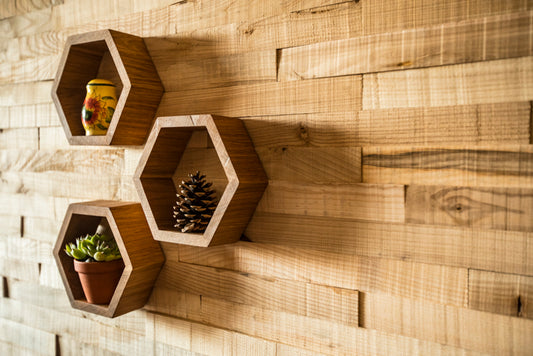 Sechseckige schwebende Regale aus Holz